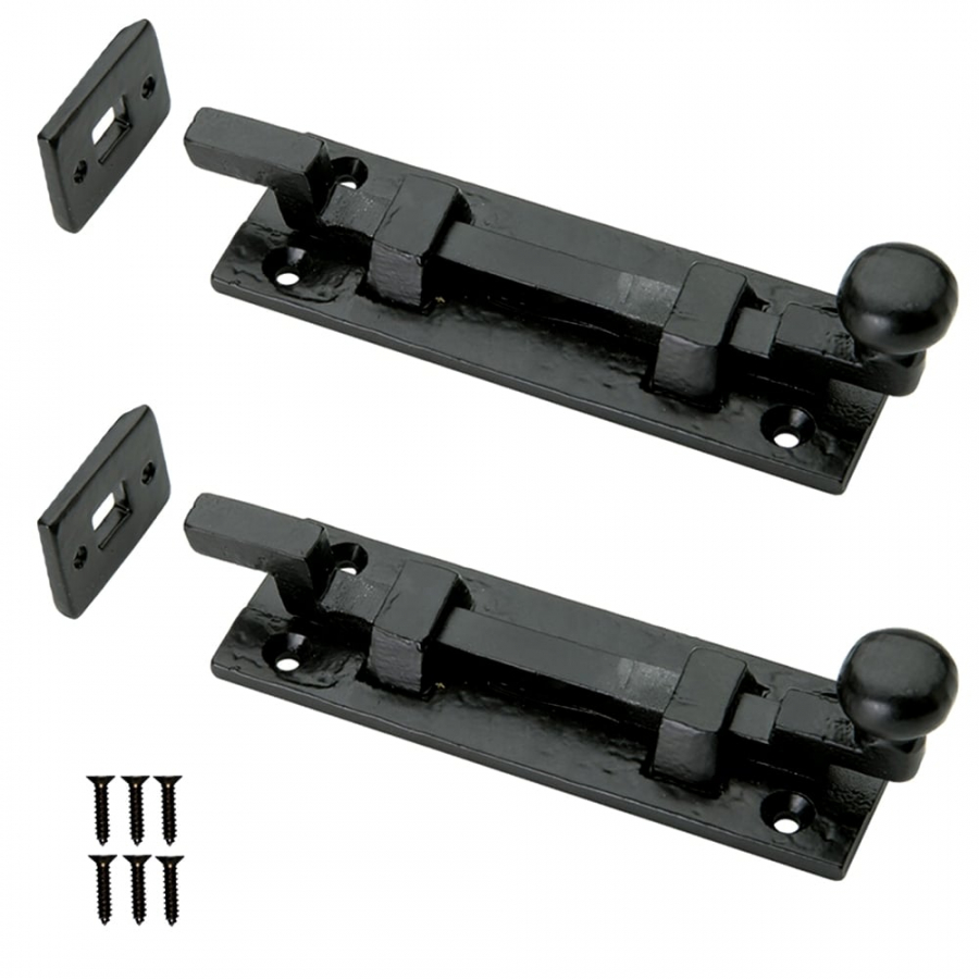 MATERIAL Black Iron TYPE Necked door lock bolt with knob STYLE Traditional black antique FINISH Black FIXINGS 25mm wood screws included ADDITIONAL FEATURES Surface mounted. Includes matching bolt keep     Description 2 PACKThese surface mounted wrought... Read More