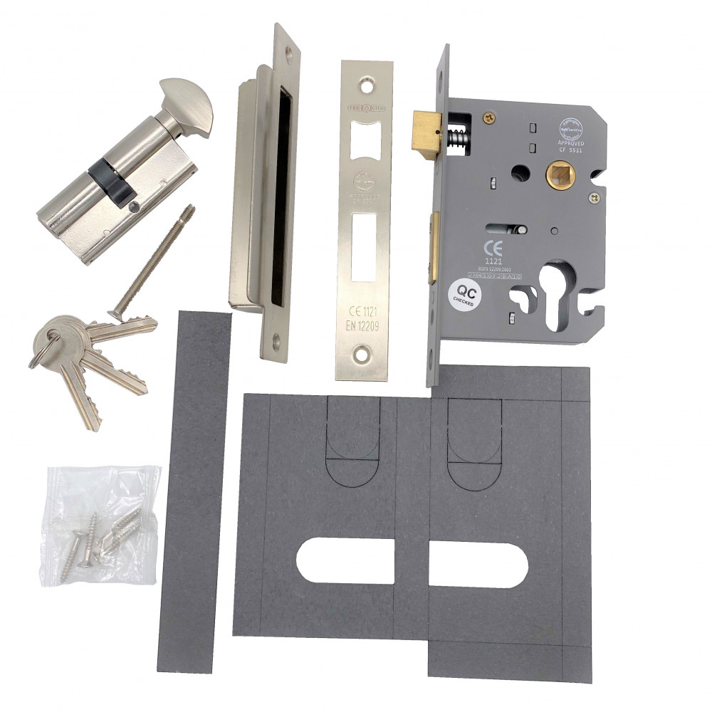 1 x 76mm BS Euro Profile Sashlock (SS)|1 x 75mm x 105mm Universal BS Intumescent kit to suit 76mm sashlock lock with backset and strike plate|1 x 70mm Euro Profile Cylinder with Thumb Turn