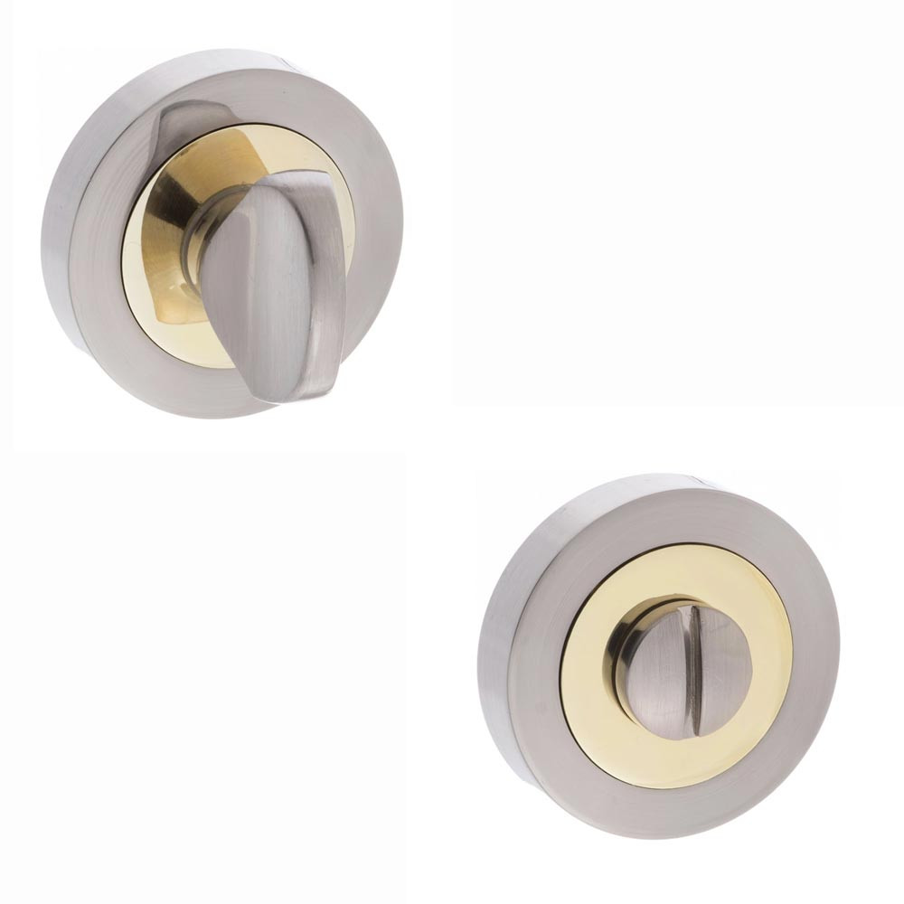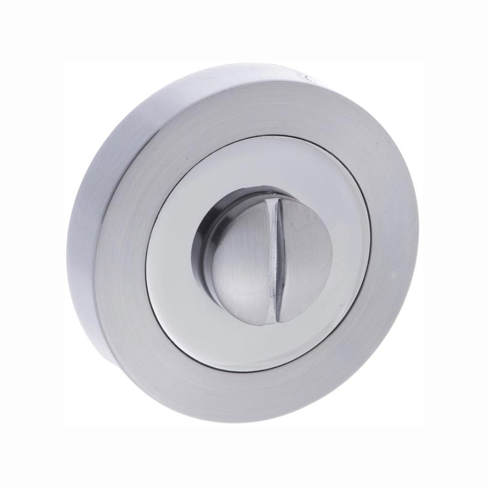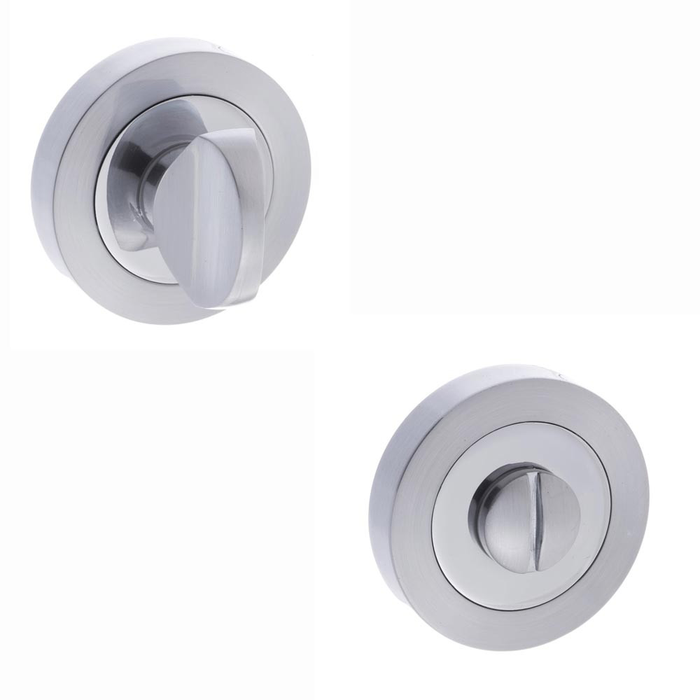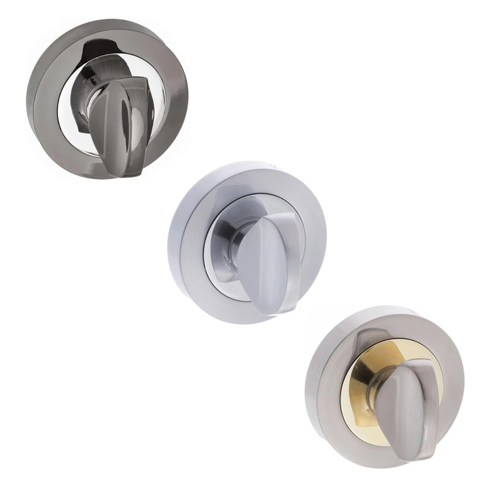 Turn and release sets are specifically designed for bathroom doors with door handles and door knobs on a rose. Situated beneath the door handle, the simple turn and release mechanism for locking and unlocking bathroom doors provides privacy to the occupant. For added safety, should immediate access to the bathroom be needed from outside in an emergency, most turn and release doors have an emergency point which can be used to unlock the door using a coin or flat headed screwdriver. Available in a variety of finishes, turn and release locks can easily be matched to your specific door handle or door knob finish.