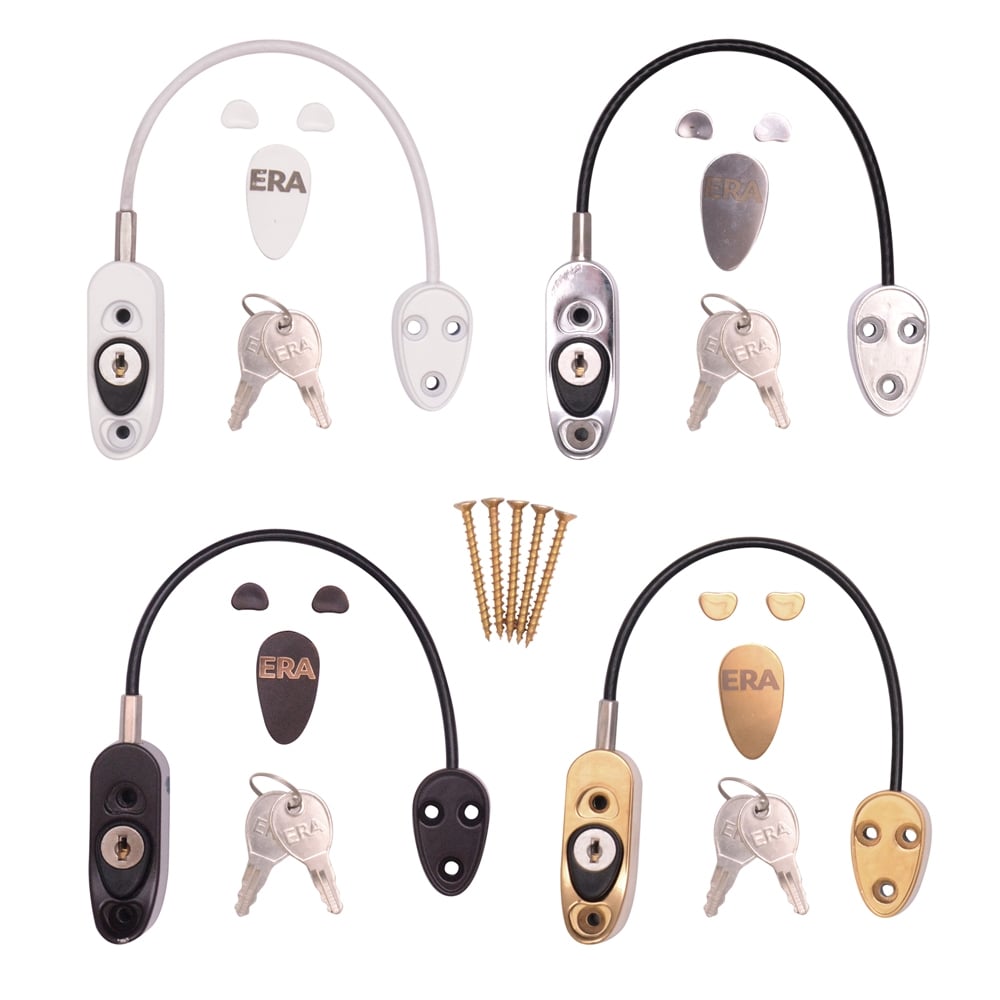 MATERIAL: Zinc alloy castingsTYPE: Window & Door RestrictorSTYLE: Cabled LockFINISH: Polished chrome, brown, polished brass and whiteFIXINGS: 5 x 4.5 x 45mm Gimlet Point screwsADDITIONAL INFORMATION: Includes 2 keys, cover caps, 5 x 4.5 x 45mm... Read More