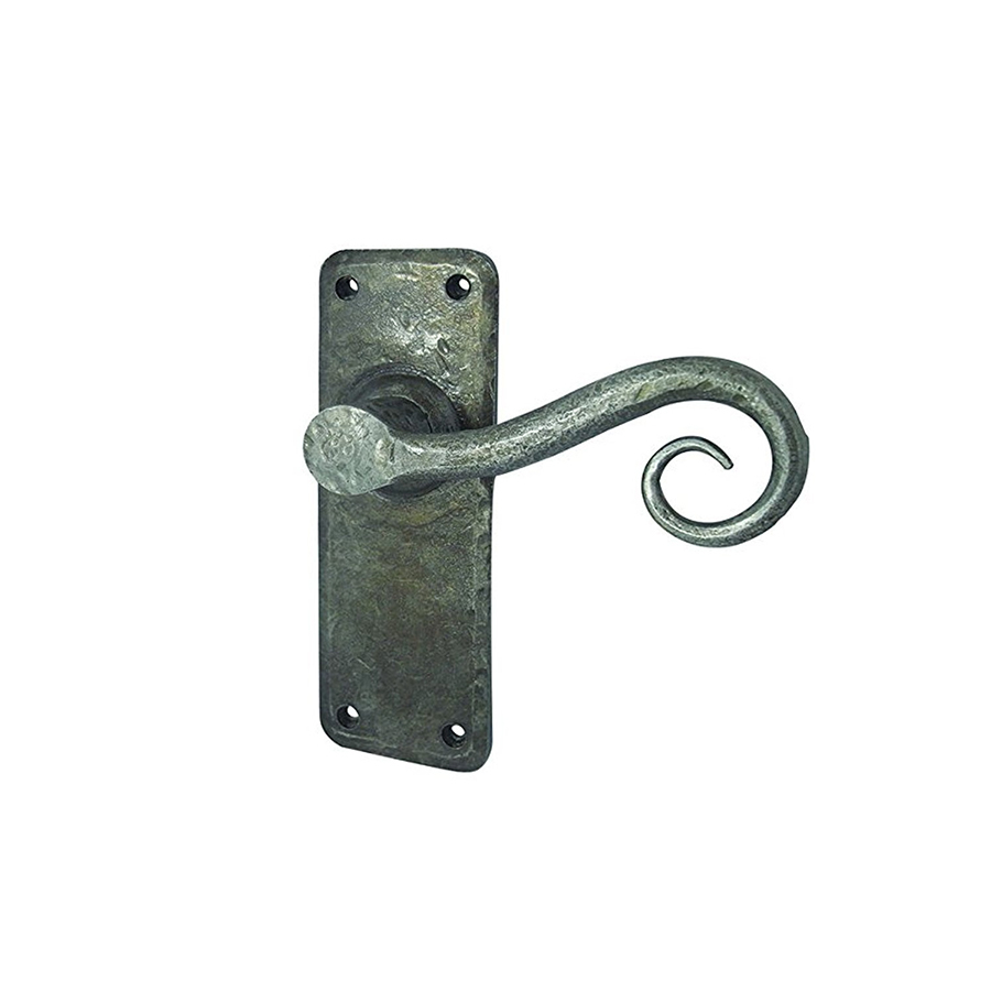 Material: Hand forged iron Type: Latch, lock or bathroom door handle pair Style: Traditional curly tail lever on back plate Finish: Pewter Fixings: 8 x 20mm pewter fixing screws & 1 x 90mm spindle (7mm diameter) included  Handle Information Sprung smooth a... Read More