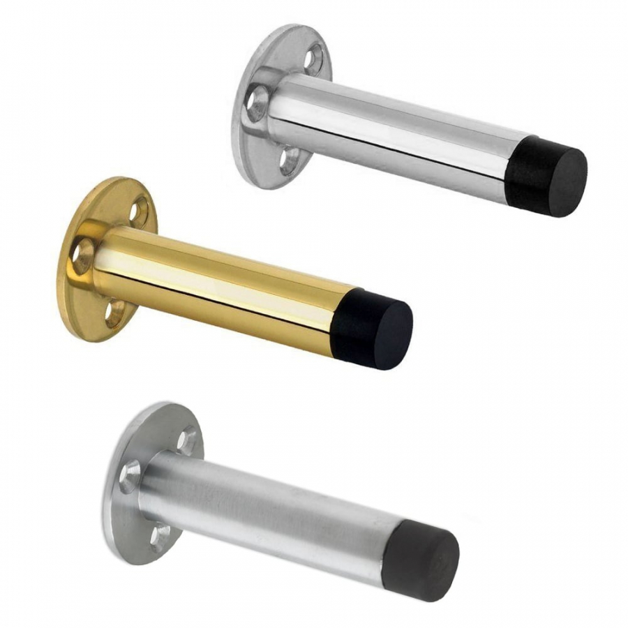 This product prevents a door from hitting a wall or over opening and can be fitted directly onto the wall or skirting board. Screws are included. The polished brass door stop has a rounded top whilst the chrome door stop have a curved top. All finishes feature a metal cylinder fixed to a rose plate, suitable for fire rated doors.