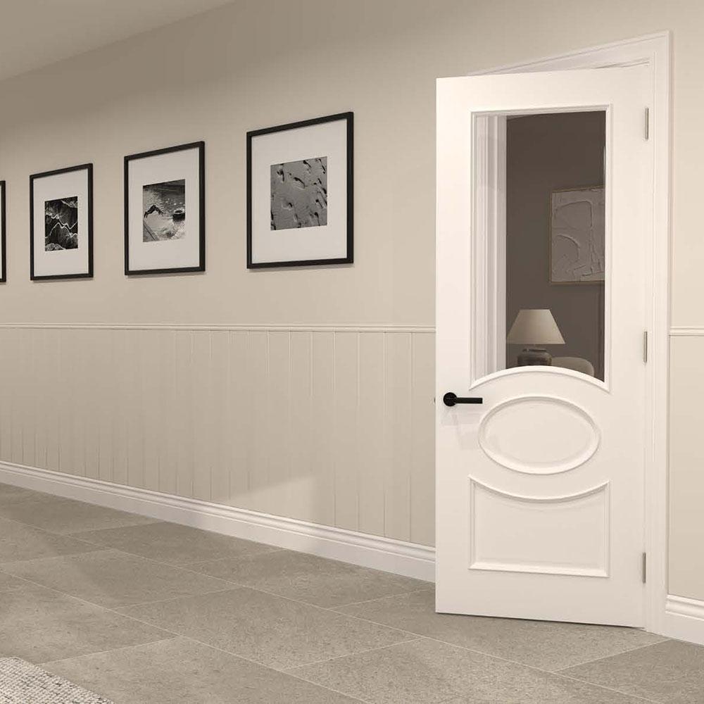 Bring classic elegance into your home with the Deanta Clarendon White Primed Clear Bevelled Glass Internal Door, inspired by traditional Victorian styling. Its distinctive triple panel design features a small lower panel, a central oval panel, and a larger glazed upper panel t... Read More