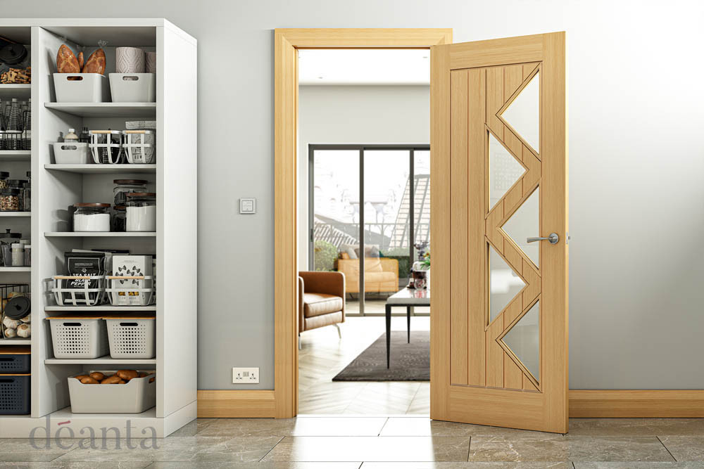 Find out moreFeaturing a stunning five-panel cottage-style appearance, this internal door from Deanta's Ely range brings an elegant and sophisticated feel to any home. Fully finished with clear glazed triangular panes and natural oak construction, it is an extremely versatile option for your home.