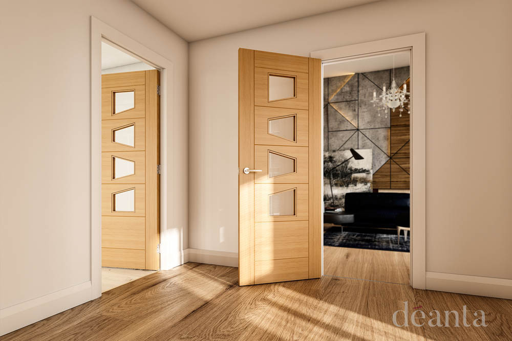 Clear glazed doors are great for brightening your interior and creating space and movement in your home. And they don't compromise the door's strength, either. Made from toughened safety glass, they provide the perfect accompaniment to the engineered core and high quality oak veneers of the rest of the door. Deanta have already added a clear lacquer topcoat, so all it needs are the handles and hinges and it's ready to install!
