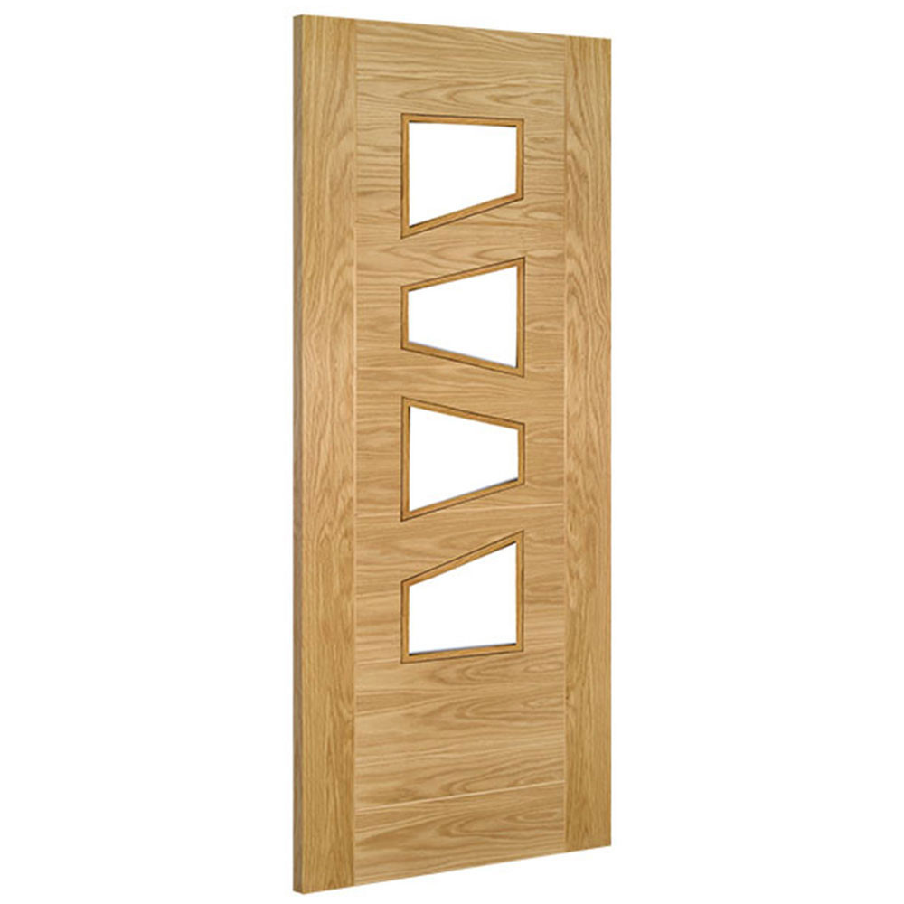 Find out moreThis addition to the Seville range from Deanta gives you that all popular ladder design, but with some fresh, contemporary angles. With four panels of slanted clear glass set in a ladder style column of natural oak, it's the perfect, vibrant addition to your on-trend interior. The door's minimalism is enhanced by raised beading surrounds and simple straight horizontal and vertical grooves. Together with solid door options from the Seville range, this door makes the perfect stylish theme for your home.