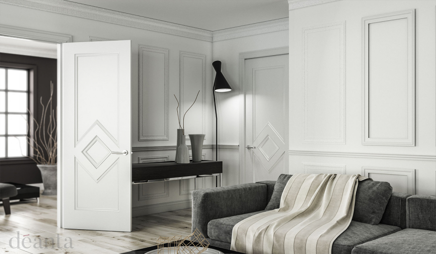 The Ascot internal door collection from Deanta features a large inset panel with a unique diamond design. This white door is delivered primed. The contemporary style of this door makes it a perfect choice for on-trend interiors.