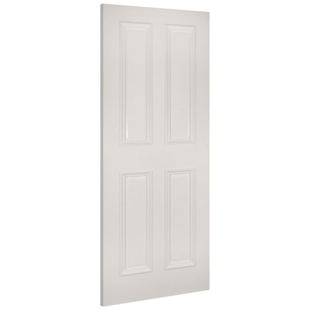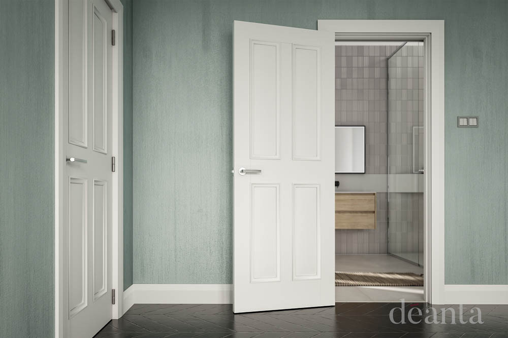 The Rochester range of internal doors from Deanta offers you an FD30 fire door with a classical period four-panel door. The door has beautiful raised mouldings. This white door is delivered primed. A traditional interior will be complimented by this Victorian style of door.