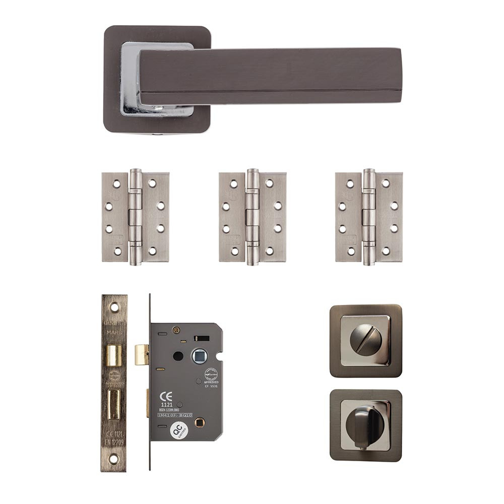 The Invictus bathroom kit, from Deanta, features all of the essential door hardware elements needed for your bathroom doors. Not only does the kit consist of a stylish Invictus design lever handle in a matt satin black finish, it also includes a matching thumb turn lock and set of three hinges.