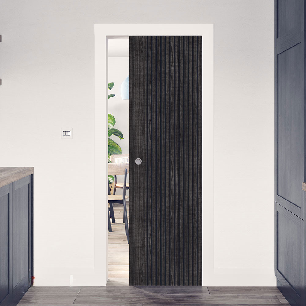 Made with exquisite Dark Grey Ash veneers and a uniquely grooved surface, this Fluted Fully Finished Internal Door from Deanta's Malmo range will create a striking aesthetic for your living space, infusing effortless sophistication, depth and texture into any modern setting.