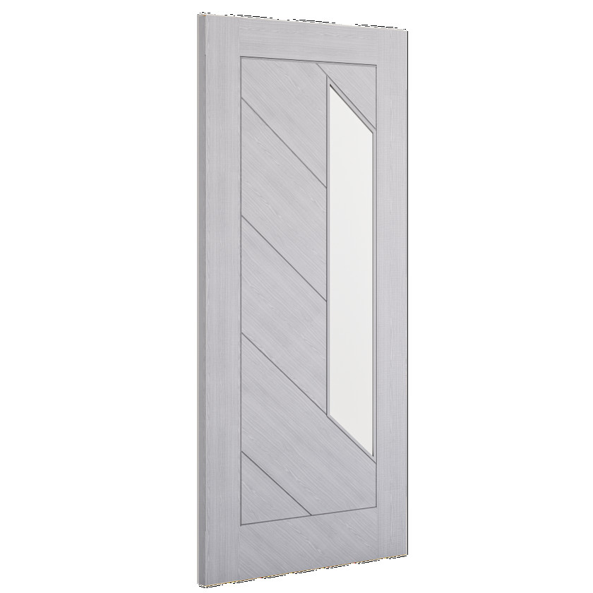 Add a stylish ultra-modern element to your home with the Torino Contemporary Fully Finished Light Grey Ash Clear Glazed Internal Door from Deanta. The glazing consists of a parallelogram of clear glass which cuts across the veneers.