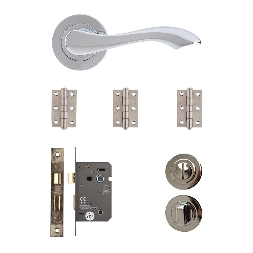 The kit consists of a stunning, sleek Veritas lever handle in a modern polished chrome finish. The kit also includes a matching thumb turn lock and a set of three steel square hinges.