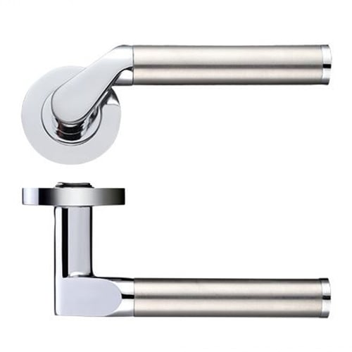 This high quality lever on rose fire rated door handle pair has been approved by 'British Standards' and comes in a satin and polished chrome finish.