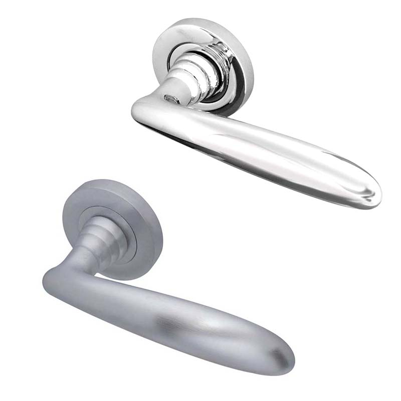 Arc designer lever on rose door handle with bolt through fixings concealed under screw on rose and secured with grub screw fixings and spindle.