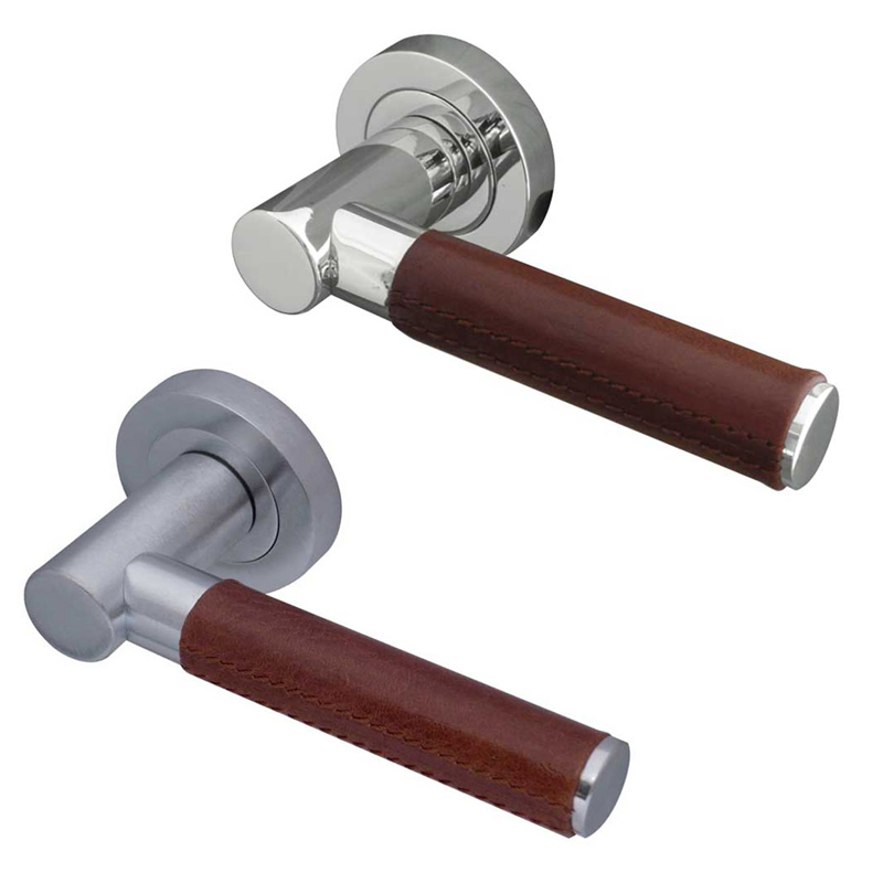 The Ascot features a real leather grip with a stitching detail across the handle. Available in either brown leather or black leather and a polished chrome or satin chrome finish. A contemporary, eye-catching set of door handles.