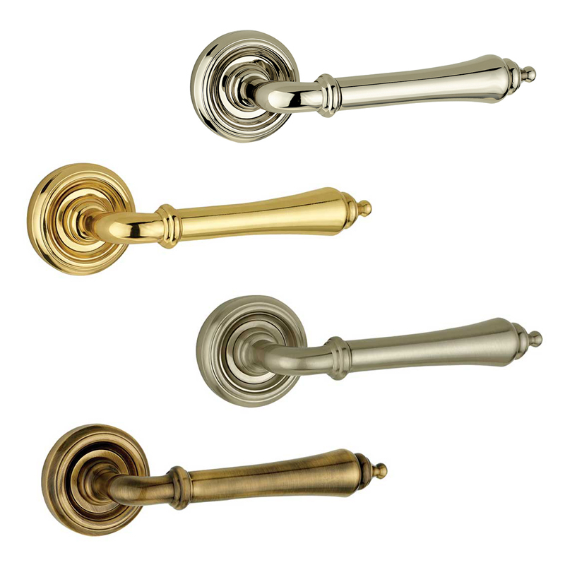The Camille lever has a smooth, faceted lever grip which is thicker than the main body enabling ease of grip. The handle is set on a round rose, which features concentric circles. Available in a antique bronze, polished brass, polished chrome, polished nickel or satin nickel. The fixings are concealed by the high quality screw-on rose.