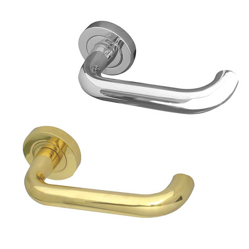 Thame round bar designer lever on rose door handle is available in a Polished Chrome or a Polished Brass Finish. Includes bolt through fixings concealed under screw on rose and secured with grub screw fixings and spindle.