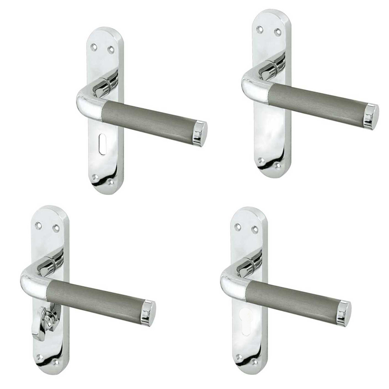 Twin Finish designer lever on rose door handle is available in a dual Polished Chrome / Satin Chrome Finish. Includes bolt through fixings concealed under screw on rose and secured with grub screw fixings into splined spindle.