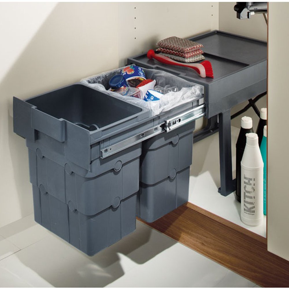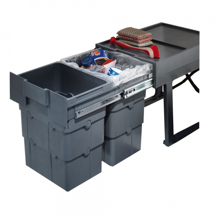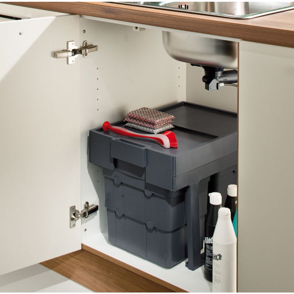 MATERIAL: Graphite grey plasticTYPE: Multi container waste bin (2 or 3 compartments)STYLE: Pull out cabinet binFIXINGS: 6 x required fixing screws included Description A base mounting multi compartment waste bin system, with two 16 litre compartments. Ideal for und... Read More