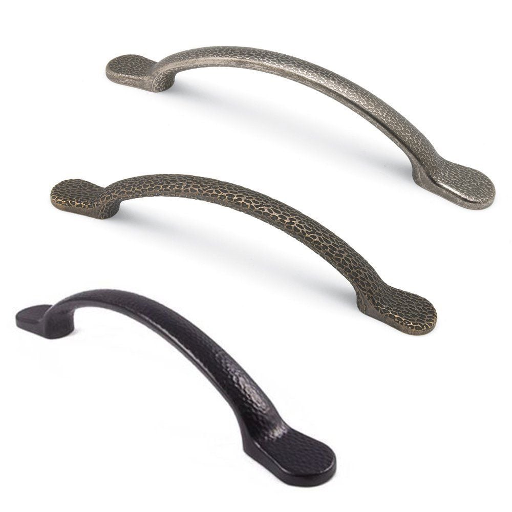 This traditional hammered effect pull handle is durable and a great addition for your kitchen or household cupboards, drawers and cabinets. Made from strong and resilient metal, the handles have a hammered, beaten texture to replicate a vintage effect.