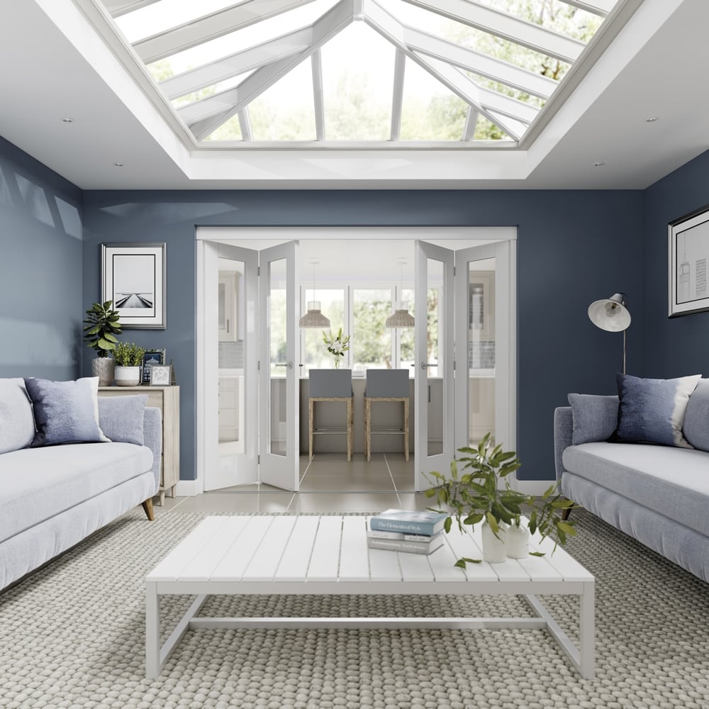 Internal White Primed Freefold Room Divider System with Pattern 10 Clear Glazed Doors