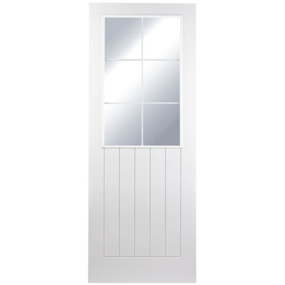 Contemporary Masonite design with five vertical panels at the bottom of door High quality moulded panel facings Textured White base coated faces suitable for on-site painting and finishing Glazing bar effect created using white decorative leading Clear glass panels are m... Read More