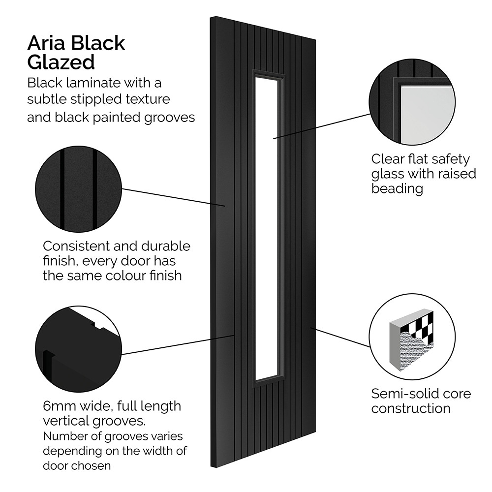 To achieve a truly cohesive look, consider pairing your Aria door with bold, matt black door hardware for a modern and cohesive aesthetic. The consistent and durable finish, coupled with a stippled texture and black-painted grooves, adds depth and visual interest to your living spaces.