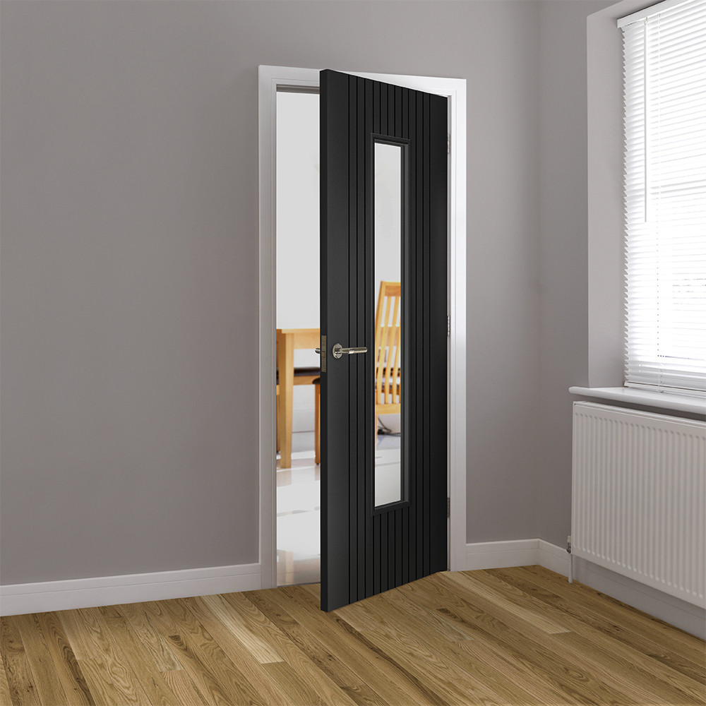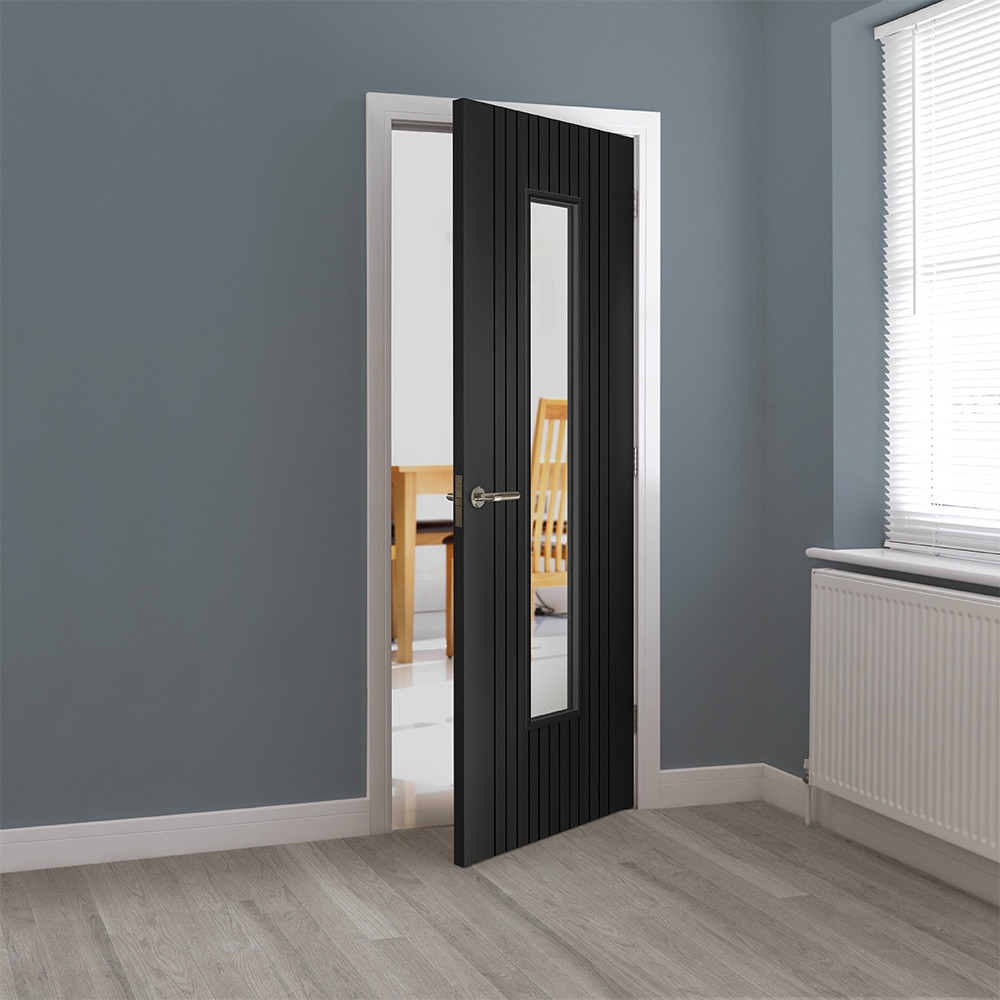 Featuring a narrow clear, flat safety glass pane adorned with raised beading, this JB Kind Aria Fluted Black Laminate 1 Light Clear Glass Internal Door provides an exquisite touch to your home's interiors and is ideal for rooms in need of increased natural light, especially wh... Read More