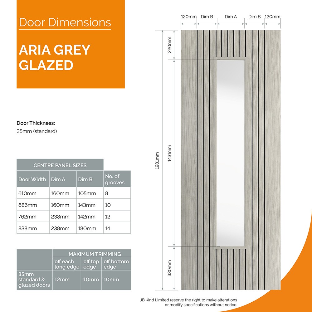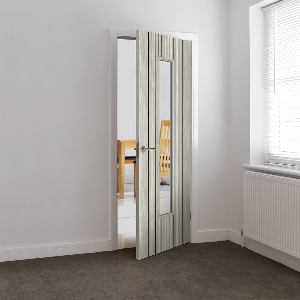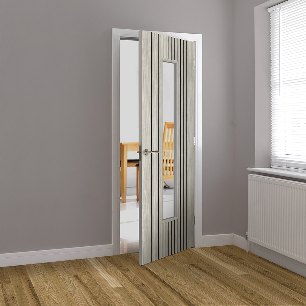 Featuring a narrow clear, flat safety glass pane adorned with raised beading, this JB Kind Aria Fluted Grey Laminate 1 Light Clear Glass Internal Door provides an exquisite touch to your home's interiors and is ideal for rooms in need of increased natural light, especially whe... Read More