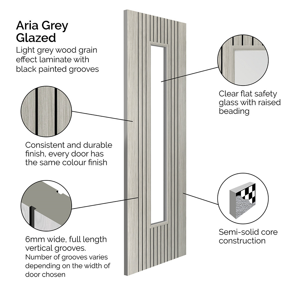 Its stippled texture and black-painted grooves, add depth and visual interest to your living spaces. To complete your look, consider pairing your Aria door with door hardware finished in light metallic finishes, such as polished or satin chrome, for a modern and attractive aesthetic.