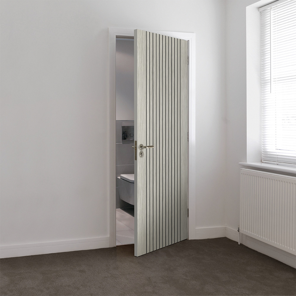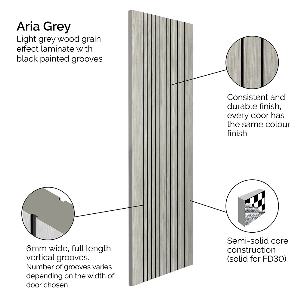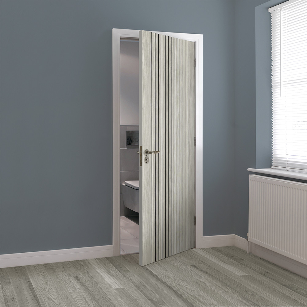 Find out moreAre you searching for a way to add a touch of bold style to your living spaces? Look no further than the flush grooved Aria Fluted Grey Laminate Internal Door from JB Kind. It is a stunning combination of modern design and timeless elegance, with a chic light grey wood effect laminate finish that will enhance any room. Whether you're aiming for a stylish minimalist aesthetic or a cool, Scandi style, this Aria door is designed to complement an array of interior styles.