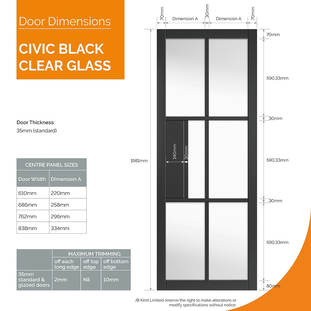 The 6 industrial style panels have clear, flat safety glass for additional safety. On top of that, the Civic Black with Clear Glass also has solid framing for extra durability and lock block for an extra layer of security. The door comes in multiple convenient sizes, as well as a bottom trim tolerance of 10mm and a side trim tolerance of 2mm. This gives you great flexibility when you're fitting it. With its minimalist, professional look and extra visibility, the Civic Black with Clear Glass by JB Kind is especially well-suited for offices, living rooms, and interior spaces that could benefit from more light.