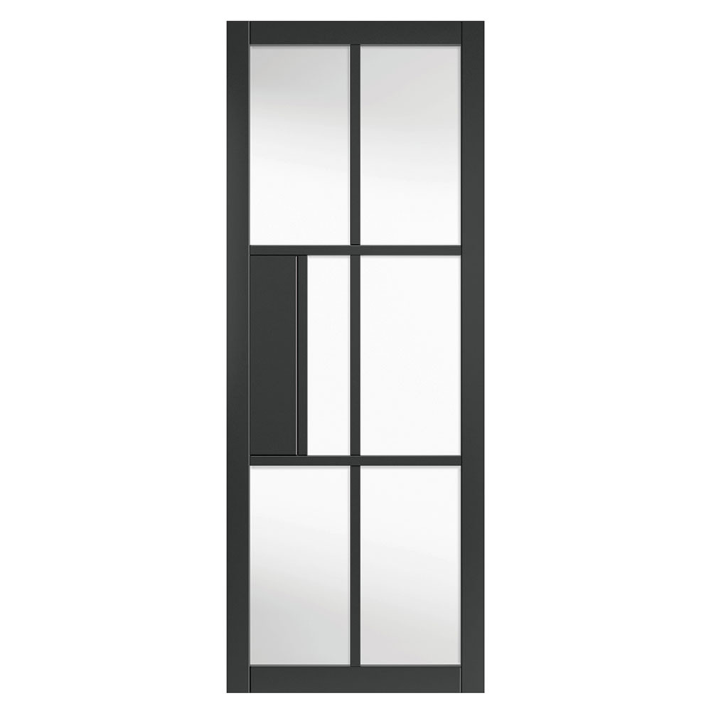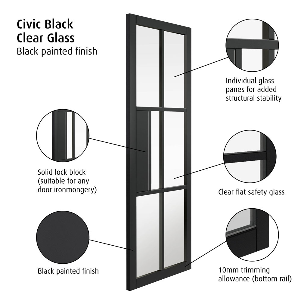 Find out moreThe JB Kind Civic Urban Black Clear Glazed door improves visibility and brings more light to your interior spaces. This modern, industrial style interior door with 6 clear glass panels also adds a touch sophisticated elegance. It's painted with a smooth black finish characteristic of contemporary design. Fully finished, the door is ready to be fitted without delay as soon as you've chosen appropriate door furniture.