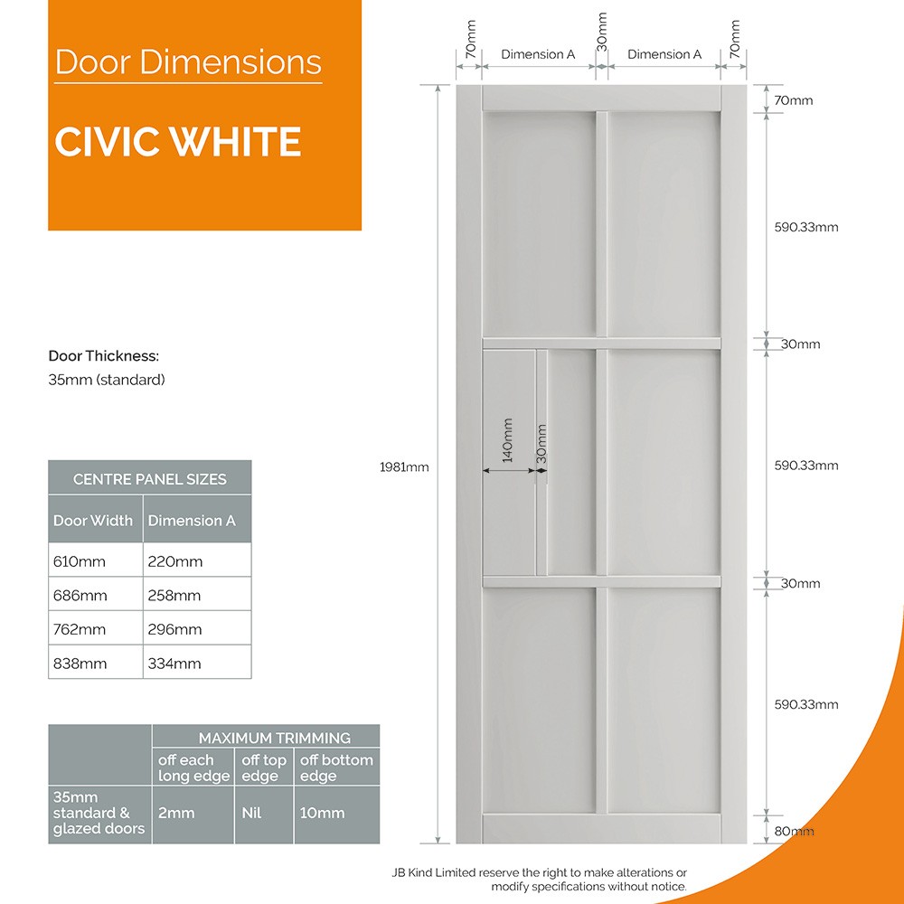Additionally, a maximum trim tolerance of 10mm on the bottom trim and 2mm at the sides of the JB Kind Civic Urban Industrial White door gives you even more flexibility when you're fitting it. All in all, the Civic White combines the timeless popularity of the 6 panel internal door with an airy, stylish, modern design and added security. The white finish makes it extremely versatile and a good match for any décor.