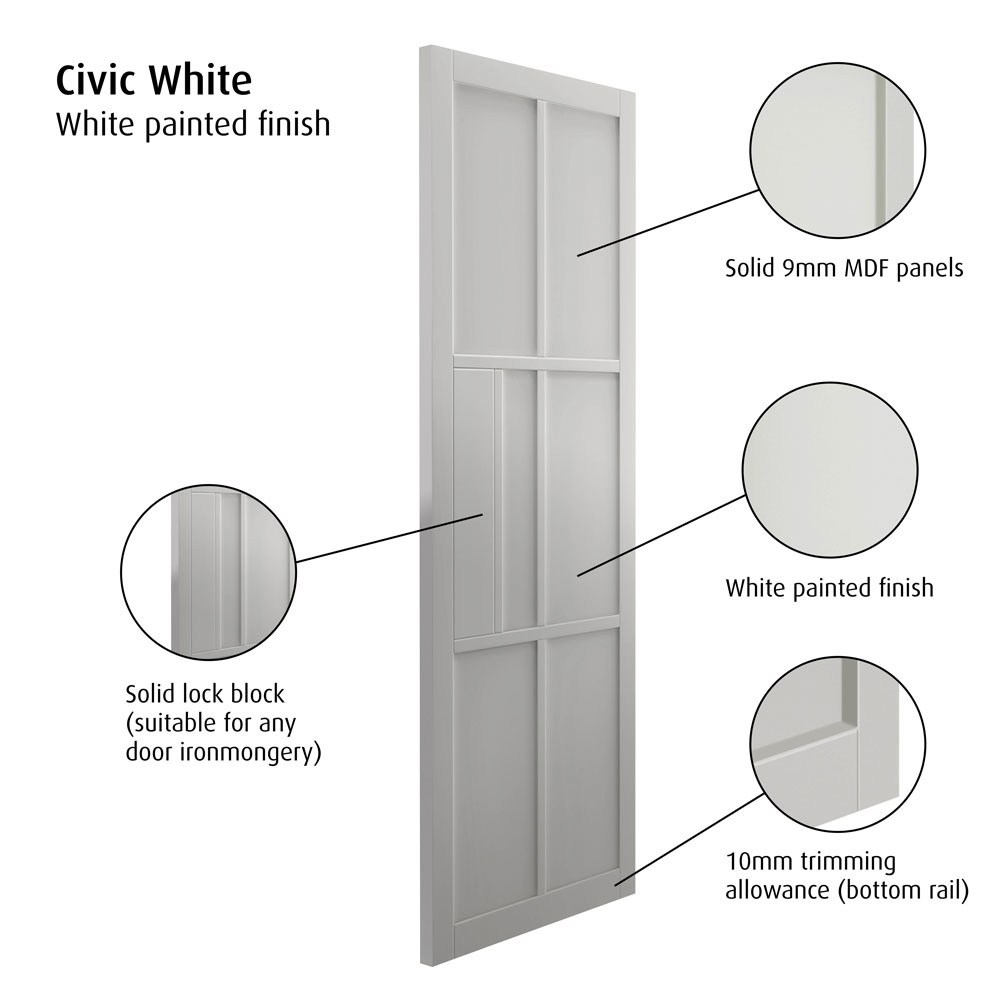 The robust 9mm medium-density fibreboard (MDF) panels and solid framing on this fully finished white internal door make it extremely durable, while the lock block adds extra security. Because it comes in multiple sizes, the Civic White is an excellent option for various interior spaces.