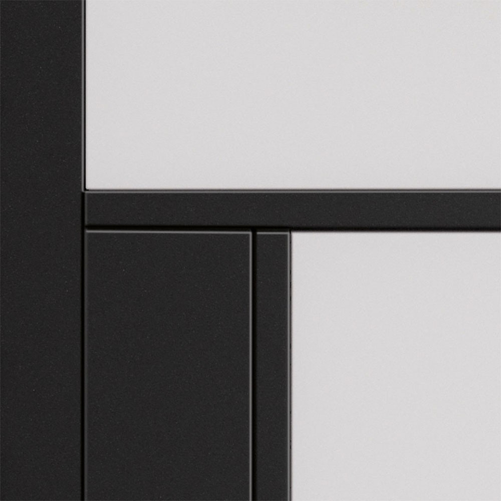 This fully finished door is ready to install, featuring a 10mm trimming allowance on the bottom rail for easier fitting. It's suitable for use with standard handles, hinges, and latches, and includes a RAL 9005 paint colour reference to assist with edge retouching if required. The clear flat safety glass enhances brightness while maintaining a clean, sophisticated look.