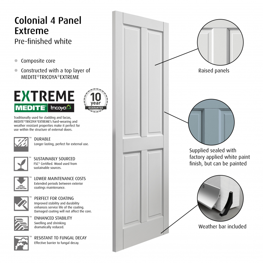 Features & Benefits: JB Kind Colonial 4 panel Victorian Fully Finished White Medite Tricoya Extreme External Front Door - 1981mm x 838mm (78x33 inch)