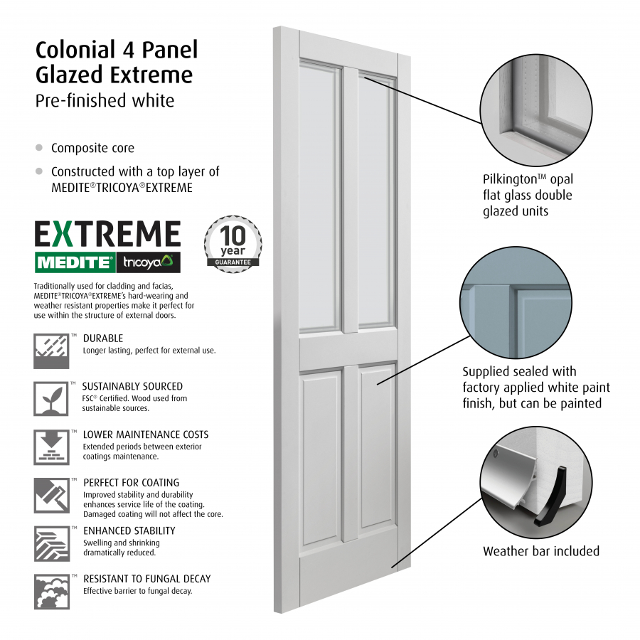 Constructed with a top layer of MEDITE TRICOYA EXTREME the Colonial from JB Kind features 2 raised bottom panels and 2 opal glazed panels, this weather resistant exterior door is a popular choice for any home.
