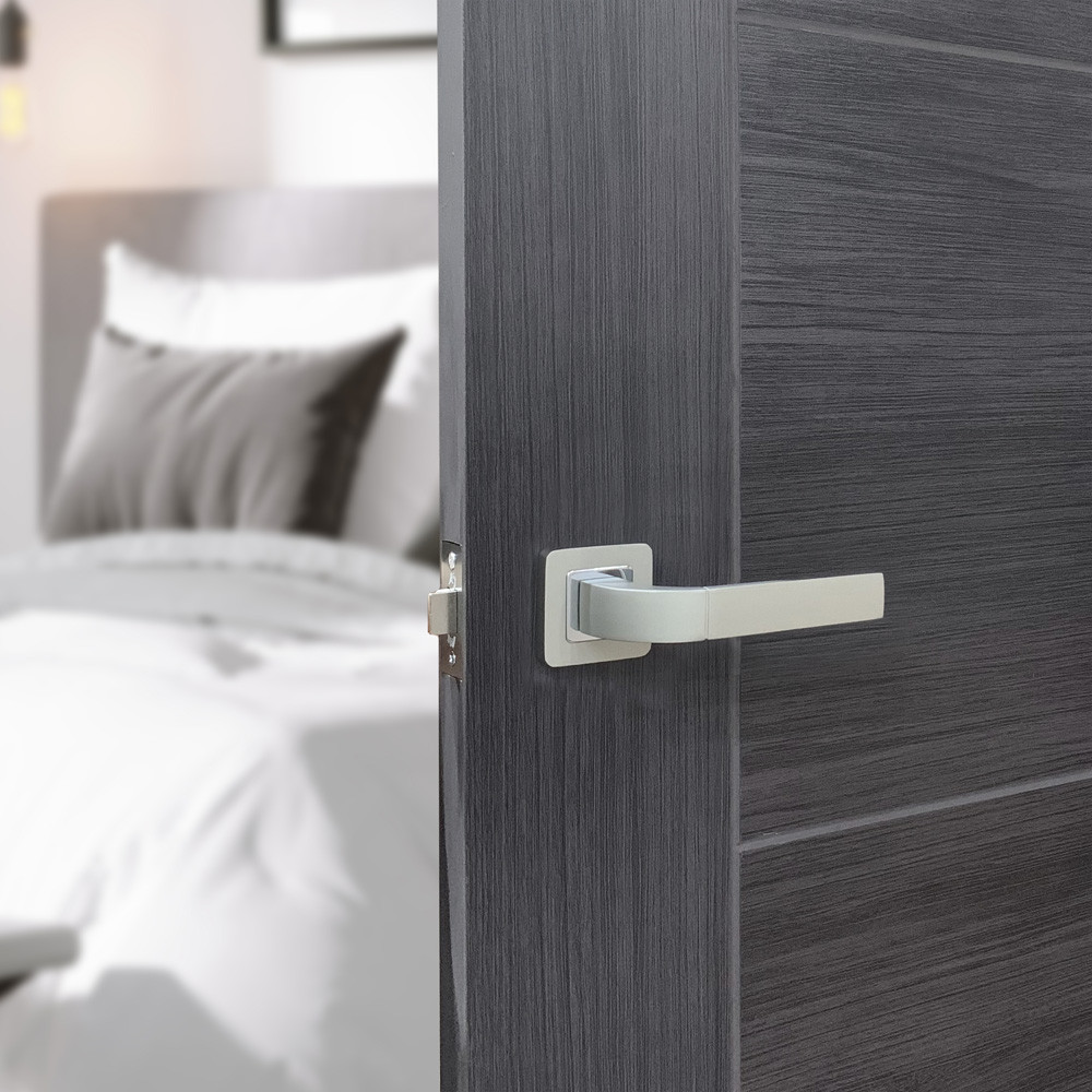 Although manufactured from aluminium, the lever on square rose is decorated in a chic satin light grey finish, with the centre of the square rose showcasing a contrasting polished chrome surface for an additional decorative flourish.