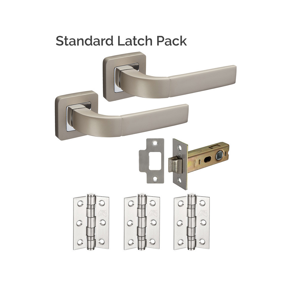 • Pack also includes three ball-bearing hinges, a tubular mortice latch and a matching strike plate