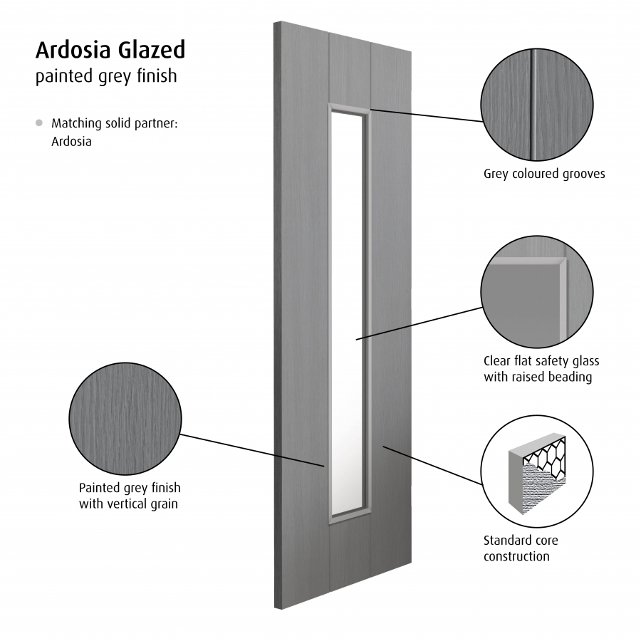 The Ardosia door range from JB Kind features a vertical timber graining effect, making each door within this range unique. This clear glazed grey door is delivered fully finished. The contemporary style of this door makes it a perfect choice for on-trend interiors.