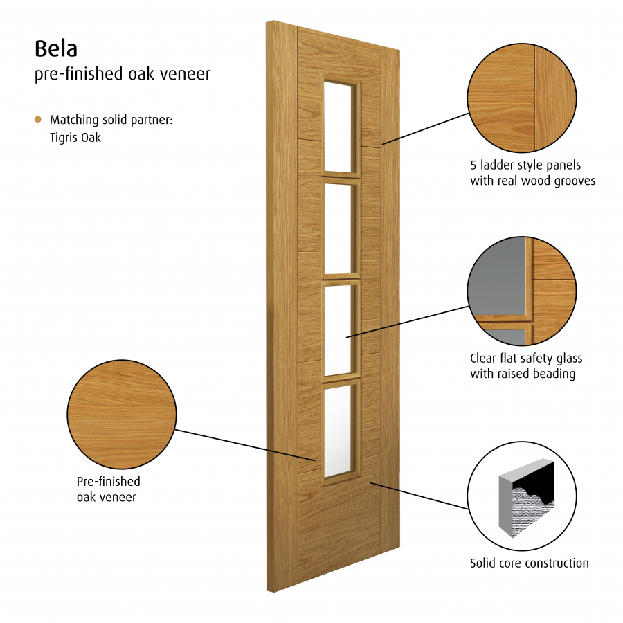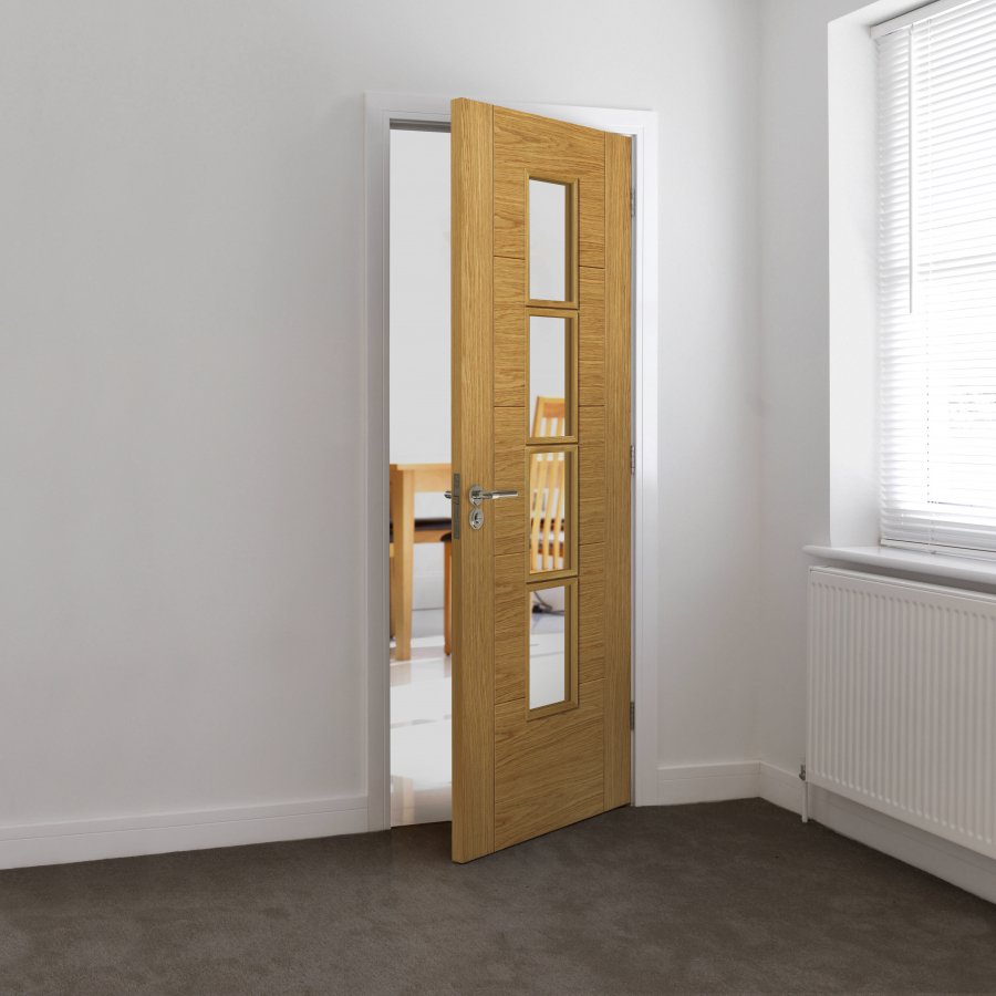 Features & Benefits: DISCON - JB Kind Bela Fully Finished Oak 4 Light Clear Glazed Internal Door