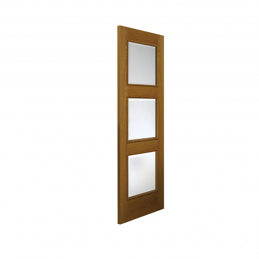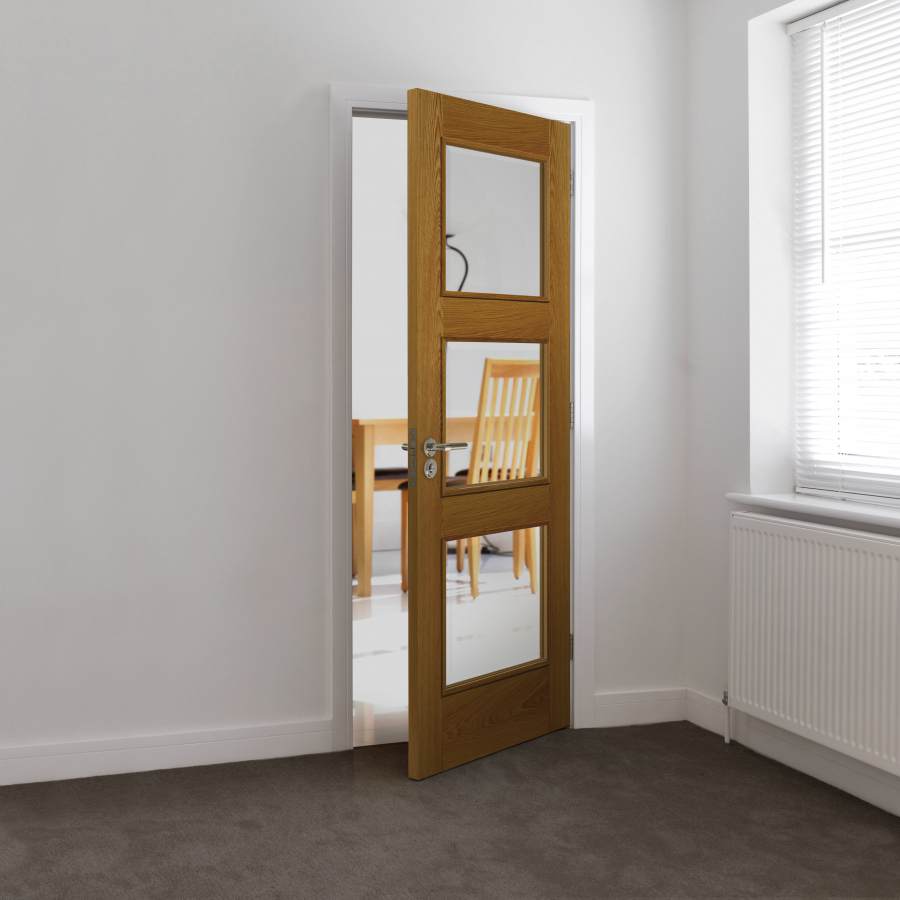 Do you want to introduce some glass with a touch of class into your home? If so, the JB Kind fully finished natural oak glazed door is definitely for you! Featuring three bevelled clear glazed panels, this beautifully grained oak door lets the light flood through your home, whilst providing a stunning feature to any room.