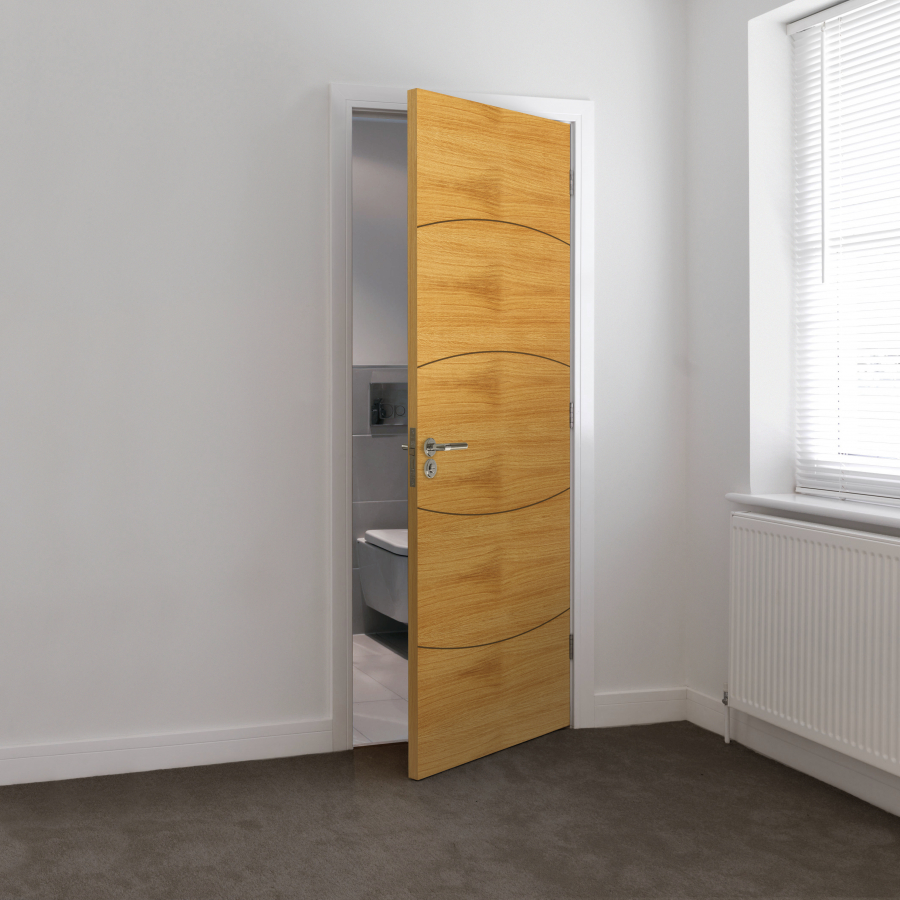 Oak veneered flush internal door Modern style with dark coloured curved grooves Decorative grooves create a panelled effect Solid core construction Supplied fully finished with a luxury varnish Fire Door options available Bespoke options available FSC chain of custody... Read More