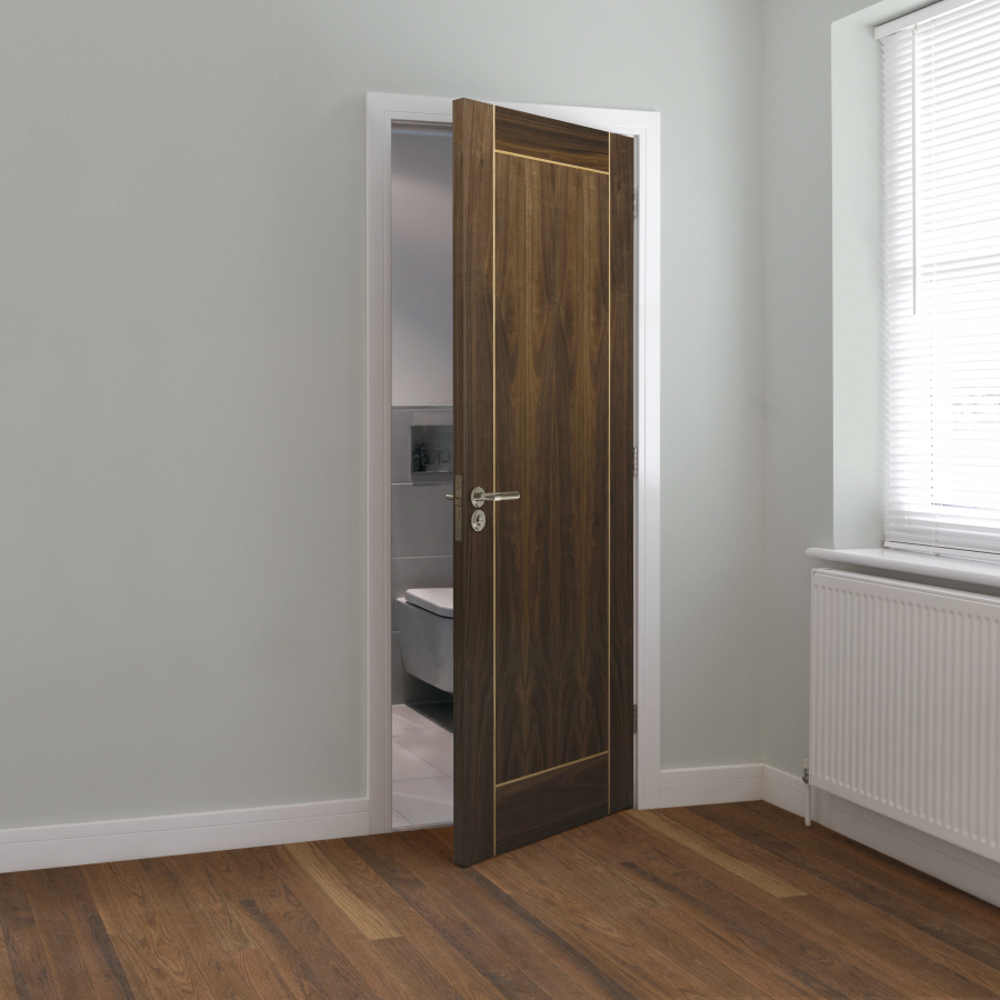 Combining clean, crisp lines with the luxurious look of rich walnut, this internal door from the Vina collection is perfect for modern homes. Featuring a bold groove inlay design that frames the central panel, it adds a touch of sophistication to your decor. This stunning door will slot effortlessly into homes of many styles so use it wherever you want to add a warm, welcoming feel, from dining rooms and studies to bedrooms and bathrooms.