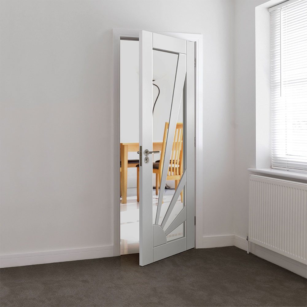 This internal door comes fully glazed with clear glazing. Clear glazing provides an unobscured view between rooms and allows ample natural light to pass through.