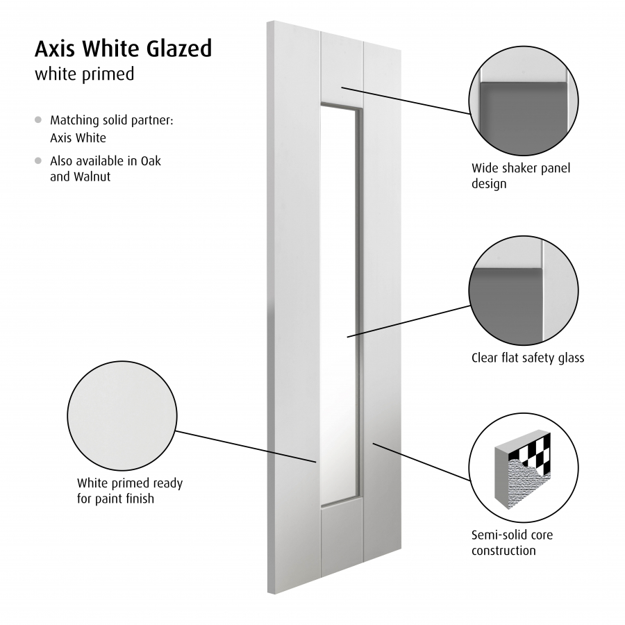 The Axis door collection from JB Kind is a range of contemporary door that features wide Shaker panels. This clear glazed white door is delivered primed. The contemporary style of this door makes it a perfect choice for on-trend interiors.