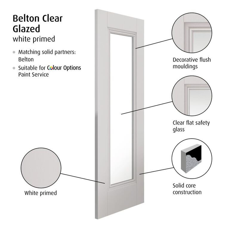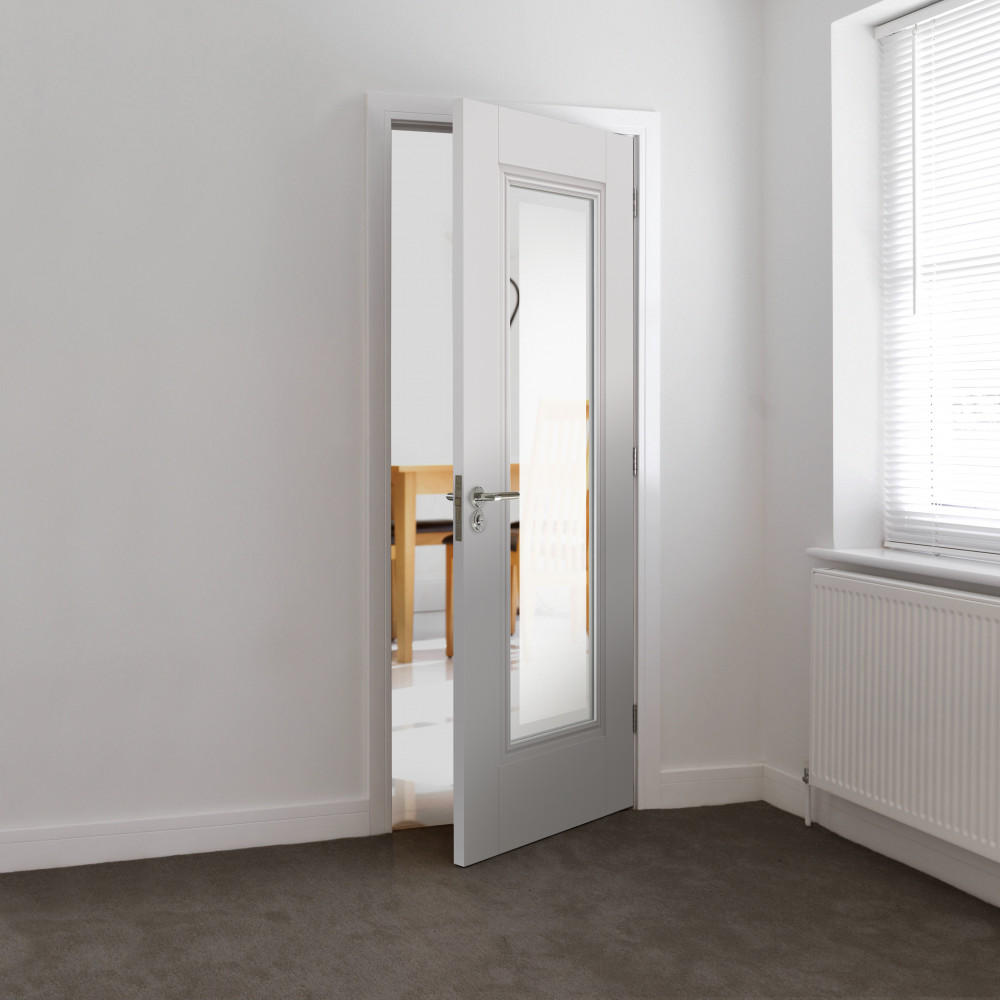 The Belton range of doors from JB Kind is a classic range of internal panelled door that features a flat recessed panel with decorative flush mouldings. This etched glazed white door is delivered primed. The contemporary style of this door makes it a perfect choice for on-trend interiors.