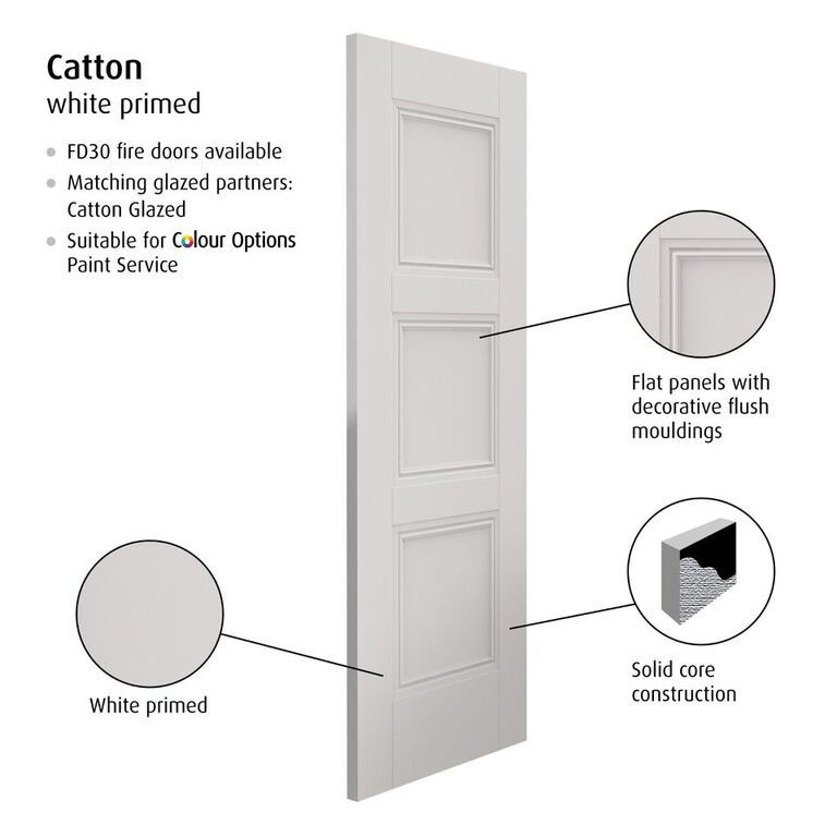 The Catton collection from JB Kind is a classic panelled door design featuring flat recessed panels combined with decorative flush mouldings. This white door is delivered primed. The contemporary style of this door makes it a perfect choice for on-trend interiors.