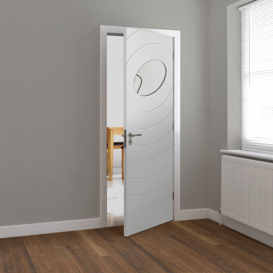The Oriole range of doors from JB Kind is a contemporary flush design that features stylish curved grooves that give this door a unique and fun twist. This clear glazed white door is delivered primed. The contemporary style of this door makes it a perfect choice for on-trend interiors.